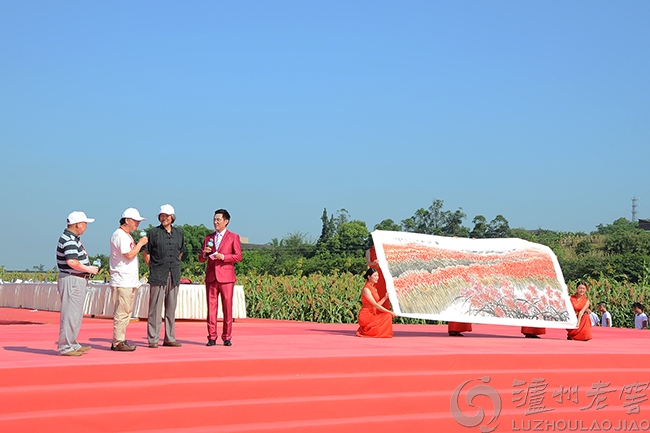 活動一開始,舞獅《慶豐收》與舞蹈《高粱紅了》無縫連接,演員們?yōu)楝F(xiàn)場嘉賓送上一杯“濃香國酒”國窖1573,耕耘、勞動、豐收、釀酒、暢飲的喜悅瞬間點燃全場,畫家和書法家現(xiàn)場揮毫潑墨,共同完成一幅大畫作品和書法長卷,并把畫架擺進田間地頭,現(xiàn)場寫生農(nóng)民收割高粱之景。